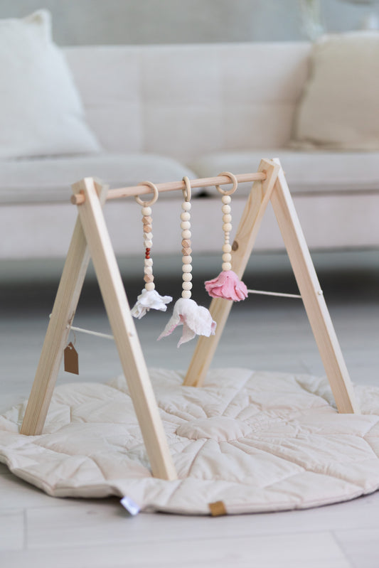 Babagym | babatornáztató rózsaszín gyapjú virágokkal