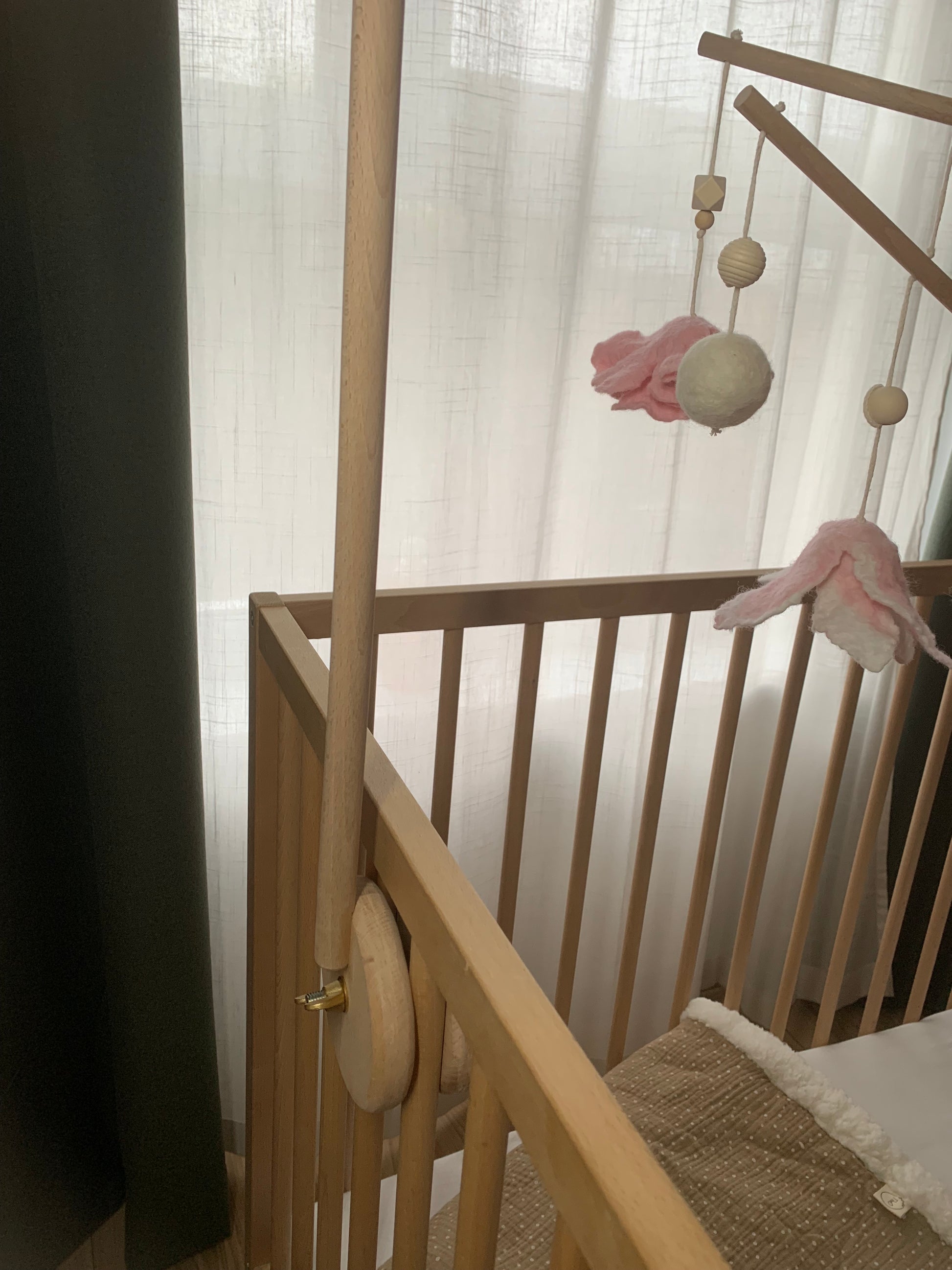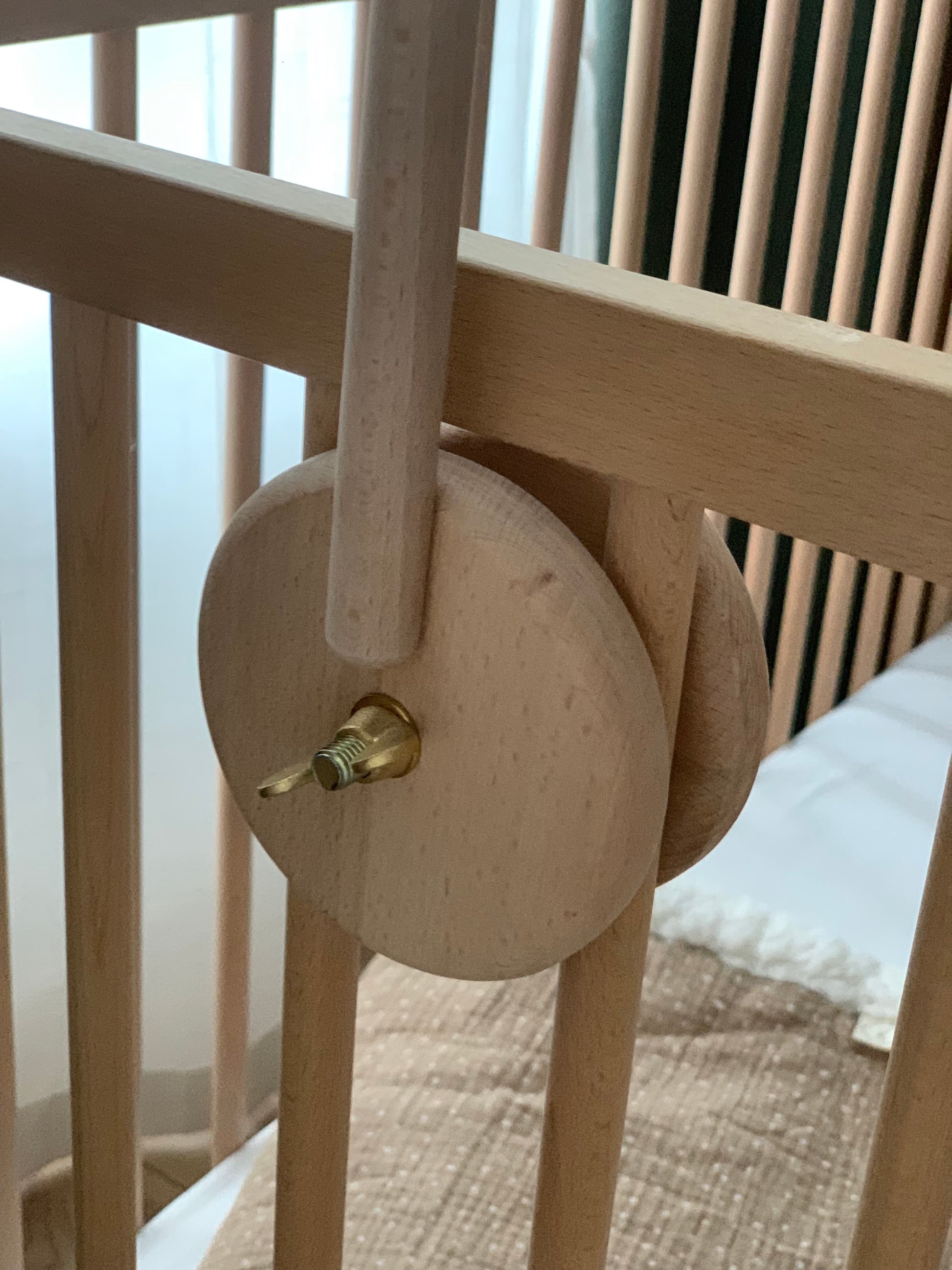 - Bükkfa elemek: Erős, tartós, mégis elegáns alapanyag. A natúr fa felület tapintása meleg és természetes, kiválóan illik a skandináv–natúr babaszobákhoz. A lécek harmonikus mozgása segíti a baba vizuális figyelmét és leköti a tekintetét.