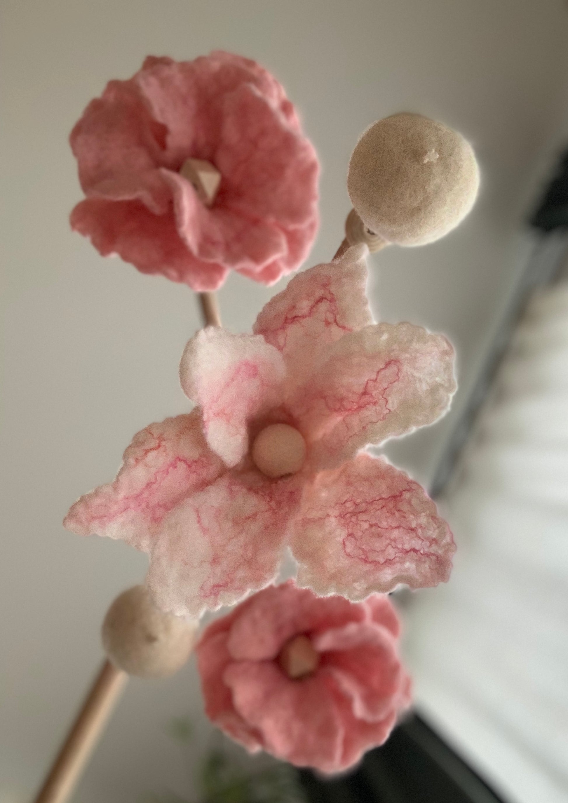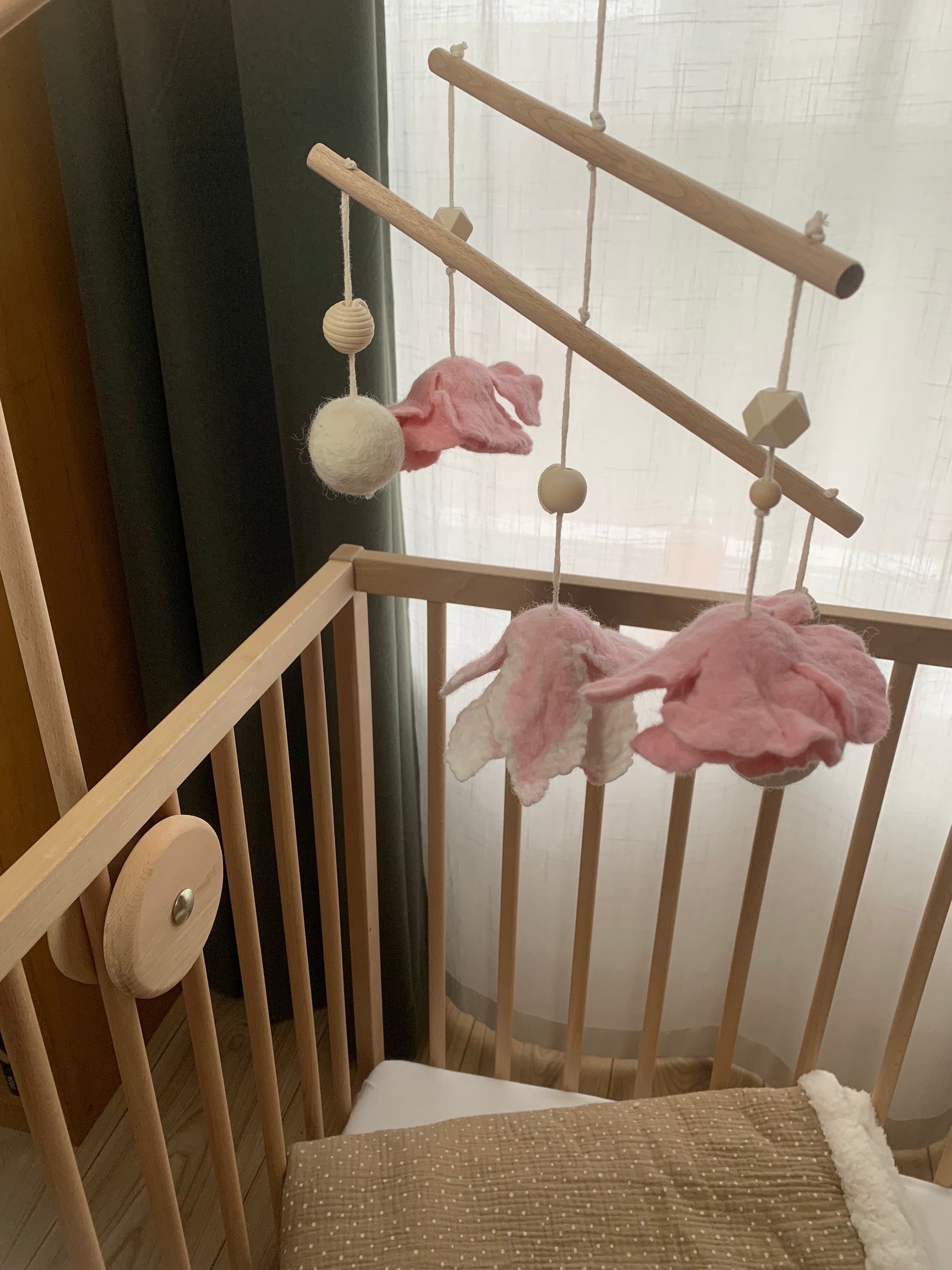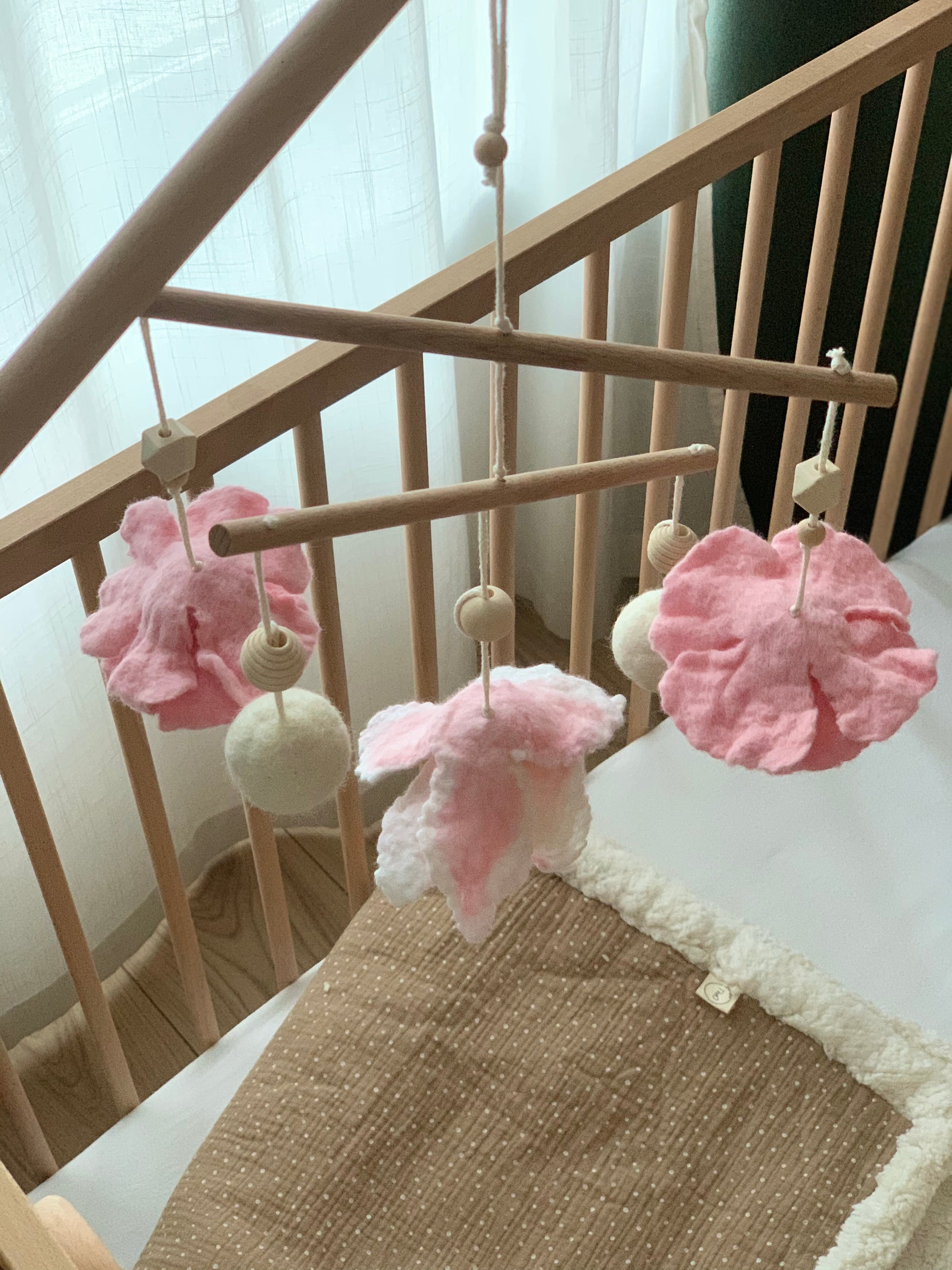 - Gyapjú filc díszek: A merinói nemezelt gyapjú puhán texturált, könnyű és kellemes látványt ad mozgás közben. A gömbök, virágok, levelek finoman, hangtalanul lengedeznek, így nem terhelik túl a kicsi érzékszerveit.